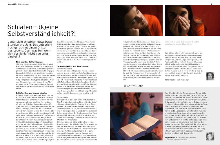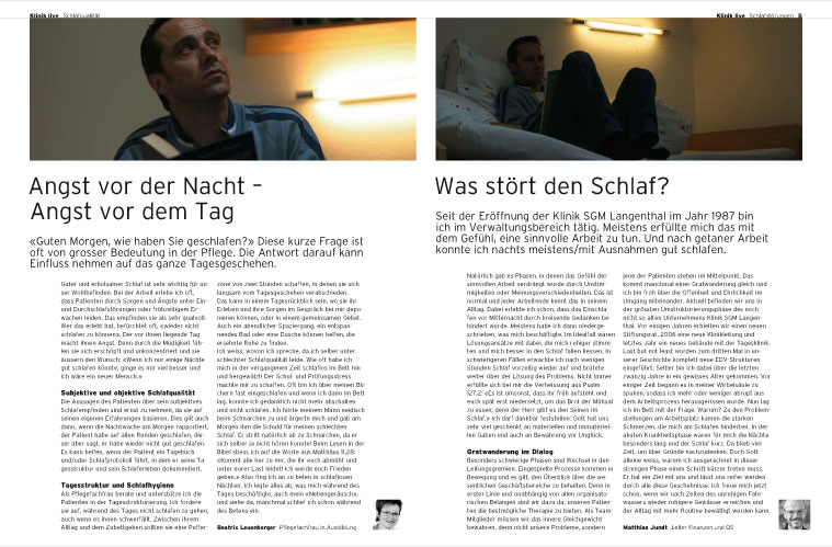 Umso wichtiger ist es, den Kontakt zu ehemaligen Patienten, Angehörigen, Mitarbeitern, Freunden der Stiftung zu pflegen. Dies geschieht unter anderem über die Zeitschrift «lebensnah». Sie erscheint vier Mal pro Jahr und erlaubt einen vielfältigen Einblick in die Tätigkeiten der Klinik. Ein übergeordnetes Thema wie Balance, Angst oder Körpersprache wird aus Sicht von Patienten und Mitarbeitenden beleuchtet. Als Redaktion waren wir gefordert, die sensiblen Berichte in eine persönliche und allgemein verständliche Sprache zu bringen. «lebensnah» entstand in Zusammenarbeit mit der Werbeagentur Basel West und dem Grafik- und Werbebüro Himmelblau.